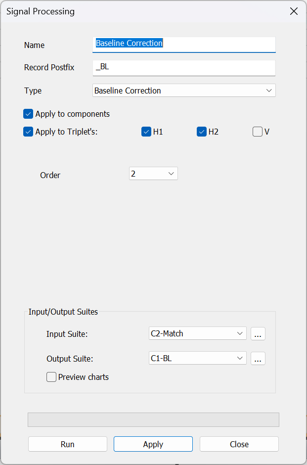 The baseline correction tool is required for some time series to correct the resulting drift in the velocity and displacement time series. It is capable of correcting a suite of records or specific components of a record.