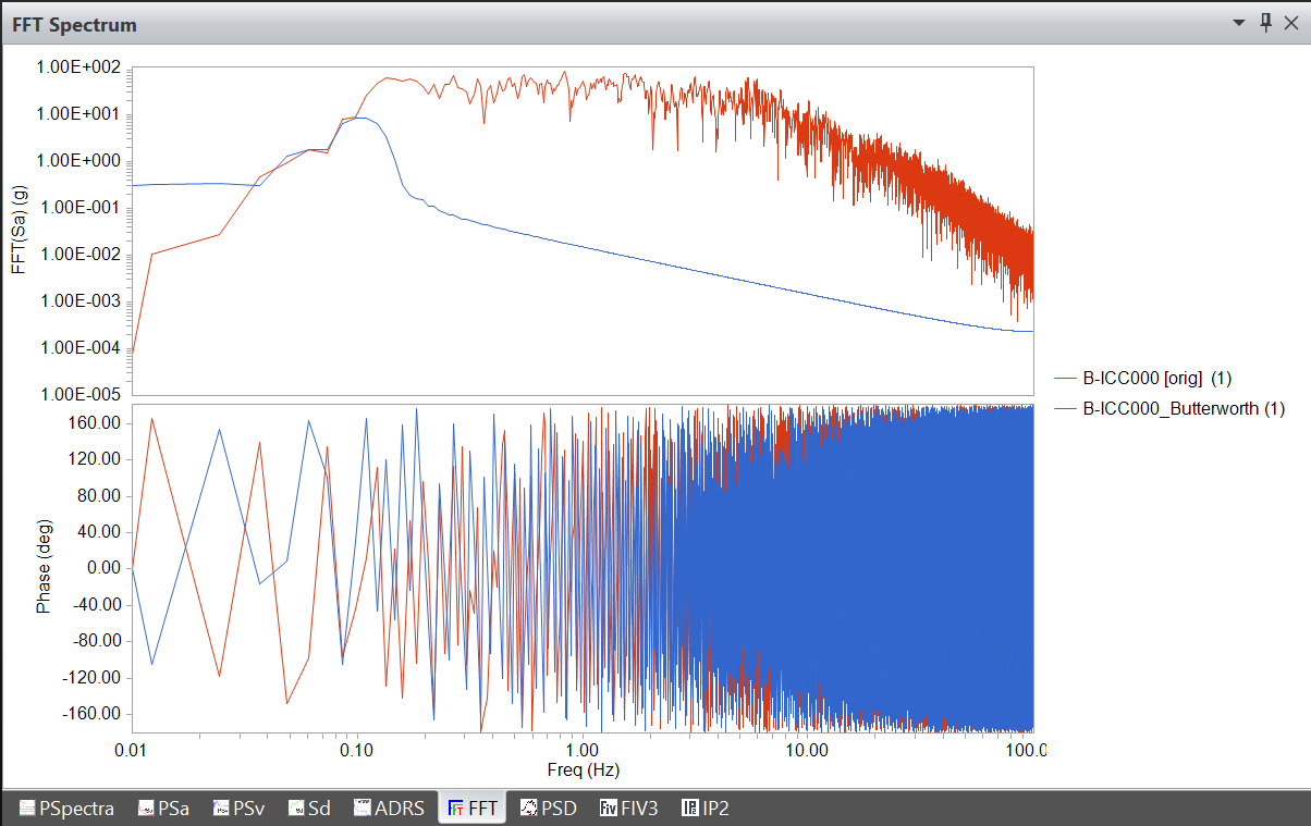 Figure: FFT Spectrum of B-ICC record before (red) and after (blue) applying Butterworth filter