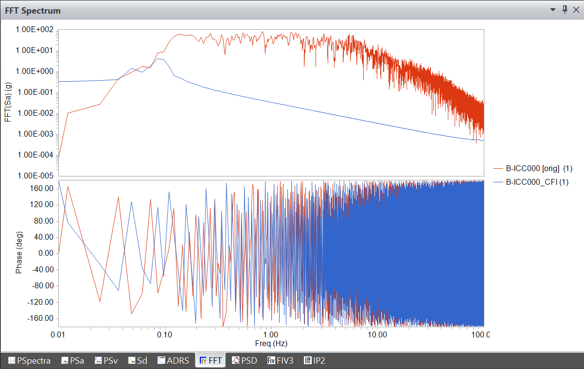 Figure: FFT Spectrum of B-ICC record before (red) and after (blue) applying Chebyshev I filter