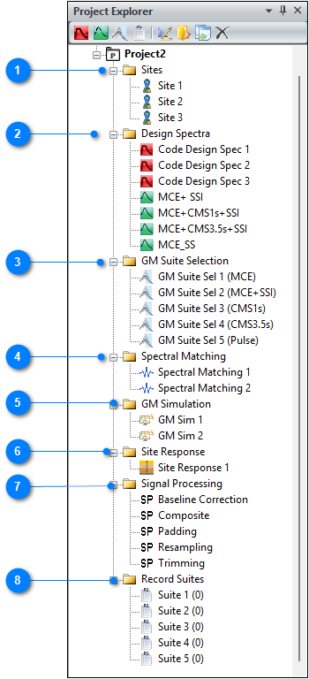 The project pane (project tree) includes the list of commands that can be performed in QuakeManager (defining Target Spectra, Selection & Scaling, Spectral Matching and Record Suites).