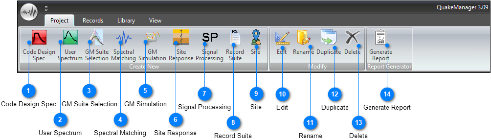 The project ribbon presents the main operations within QuakeManager including: defining target spectrum, selecting records, spectral matching, generating artificial near-fault ground motions, 1-D nonlinear site response analysis, adding/managing record suites and generating engineering and editable reports.